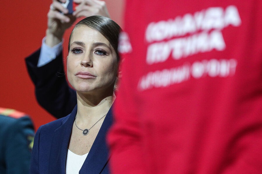 Телеведущая Юлия Барановская в штабе «Команды Путина» по выдвижению действующего президента Российской Федерации Владимира Путина кандидатом на пост президента на выборах 2024 года в концертном зале «Зарядье» в Москве, 16 декабря 2023 года