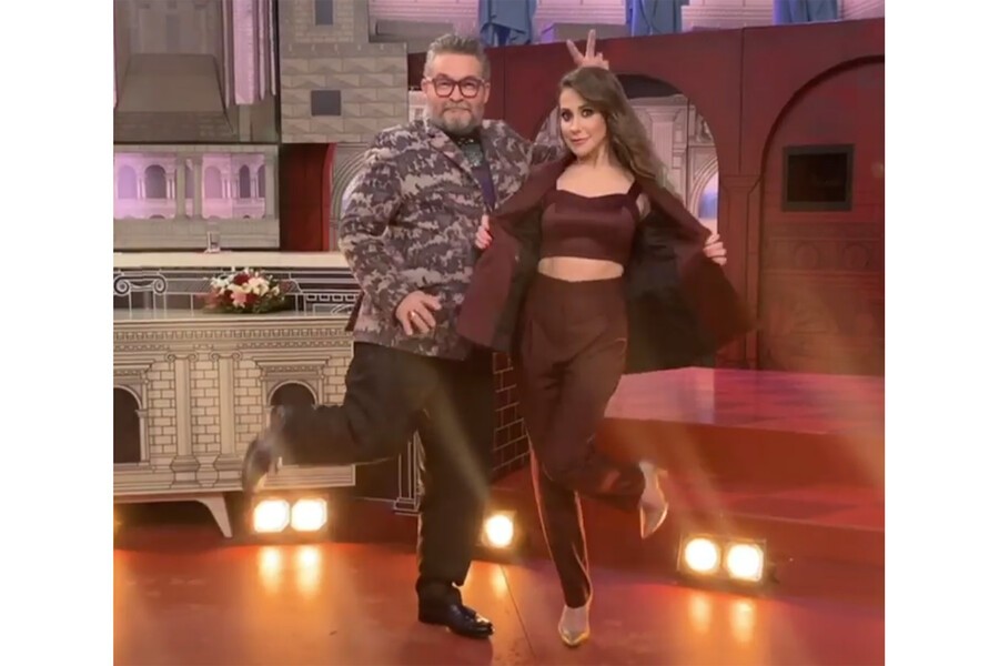 Ведущий программы «Модный приговор» Александр Васильев и телеведущая Юлия Барановская на съемках, 17 декабря 2019 года